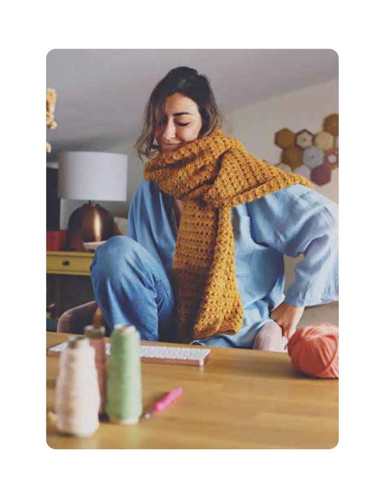 Este quadrado da avó faz-se em ida e volta. Executa-se com C de pa cruzado, pt alm rf e grupos de pa, combinando cores e texturas diferentes. As C em pt alm rf começam no 2.º pt e terminam no penúltimo pt da C anterior. Finalize com um rebordo de mpa. As corr de viragem contam como o 1.º pt de cada C. Os pts alm são de 4 passagens. Termine todas as C à medida que as faz e corte o fio.