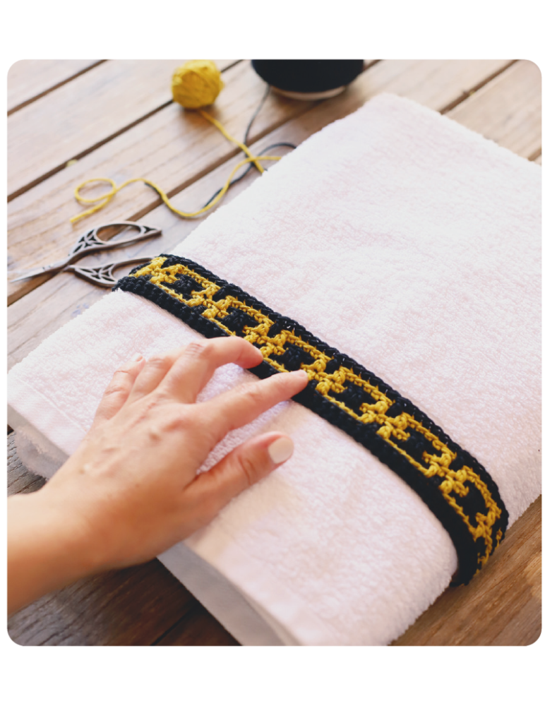 Este quadrado da avó faz-se com a técnica croché mosaico em malha plana. Quando termina cada C, corta o fio e começa a C seg. no pt inicial da C anterior, pelo que todas as C são trabalhadas pela direita, e da direita para a esquerda. As C pares, a partir da C2., fazem-se com pb lt. As C ímpares, a partir da C3., alternam pb lt e pa lf. Faça o pa lf na linha que ficou livre 2 C mais abaixo. Salte o pt que fica por trás. Com estes passos, cria-se o desenho característico da técnica mosaico. Todas as C começam e acabam com 1 pb em ambas as linhas. Faça um rebordo em pb para terminar. As corr de viragem não contam como o 1.º pt da C.
