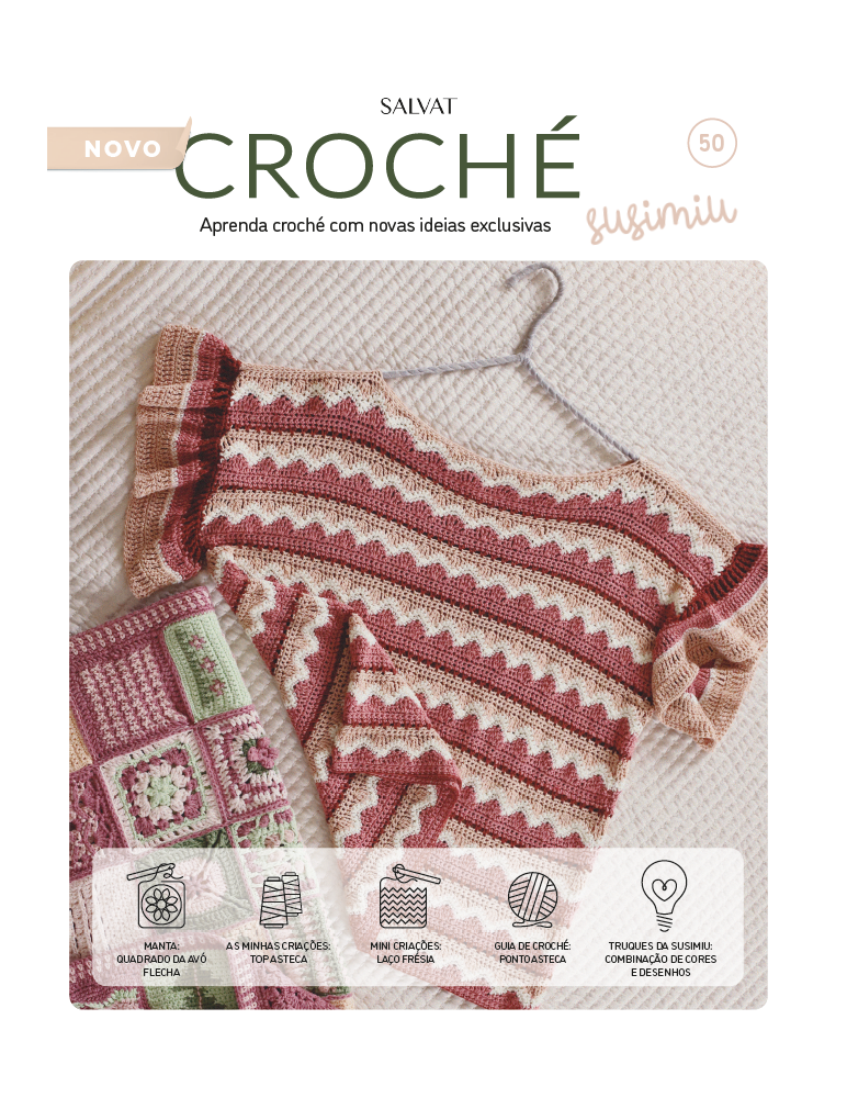 Trabalhe em malha circular com pb e pt flecha, uma variante que consiste em fazer 2 pb sobre uma C de cor contrastante (2 ou 3 C mais abaixo) para criar linhas verticais. Termine com uma C de mpa. Corte o fio na mudança de cor e esconda o secundário à medida que trabalha com o novo. As corr de viragem contam como o 1.º pt de cada C.