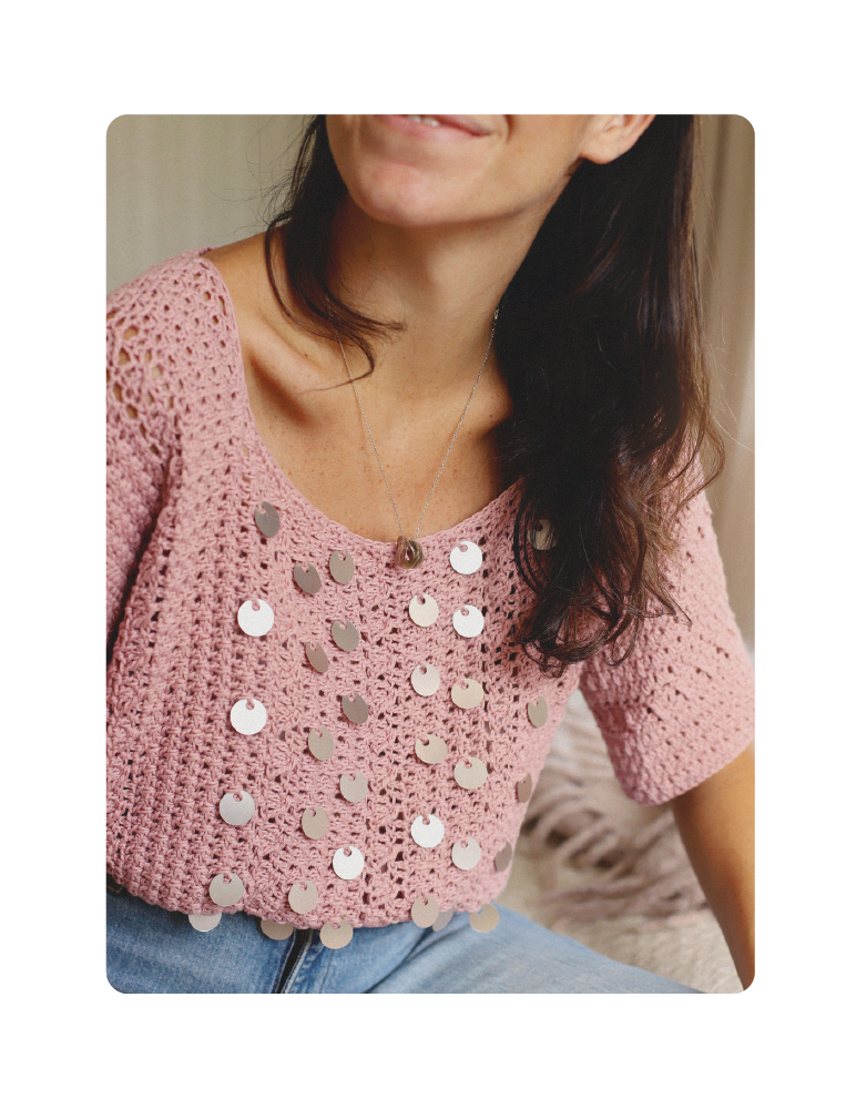 Trabalhe em ida e volta os grupos de 3 pa com um padrão aberto utilizando duas cores. Termine com um rebordo em pb. As 2 corr de viragem contam como o 1.º pt da C. A corr de viragem não conta como pt.
